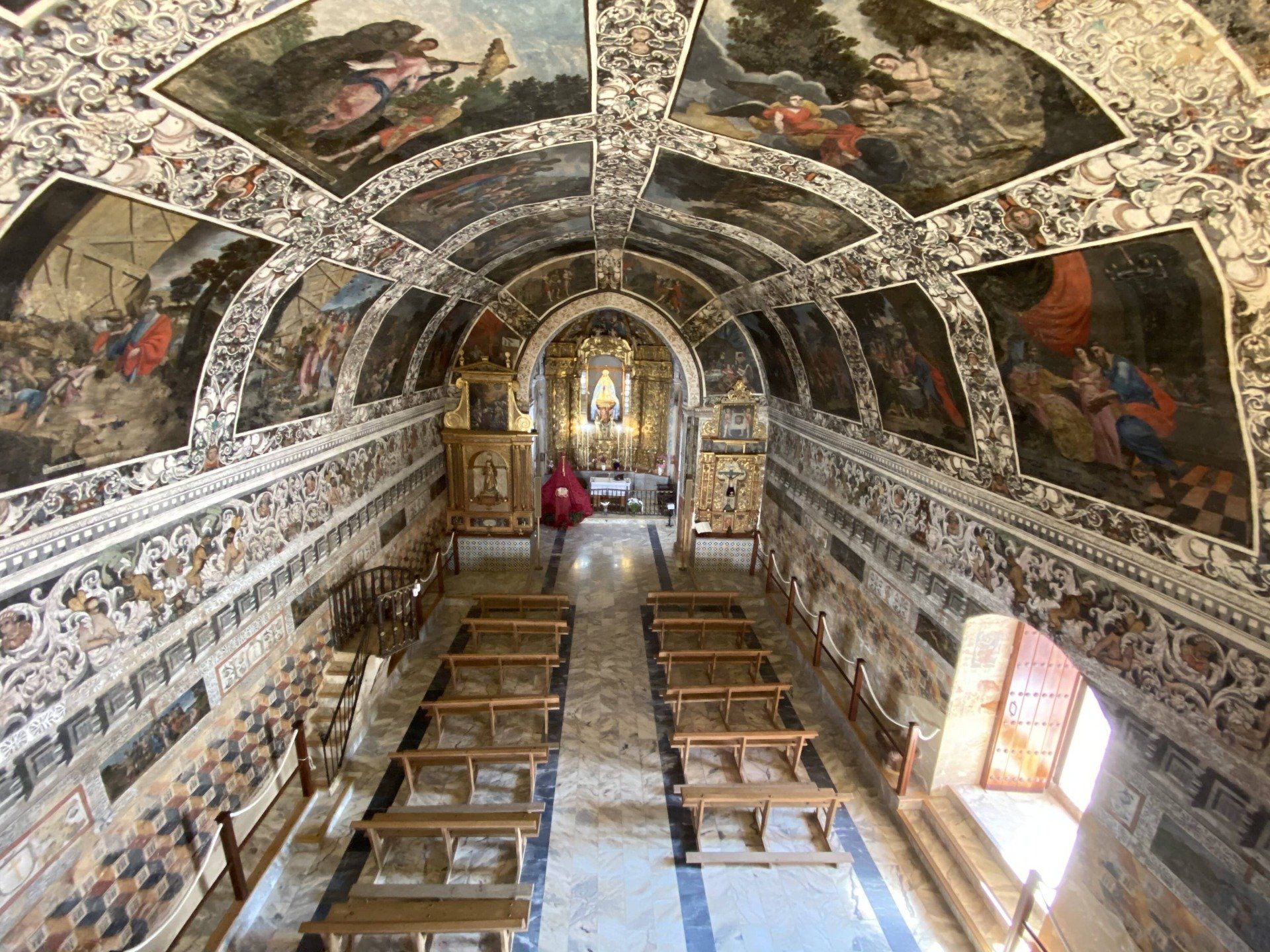 En su interior, la bóveda está decorada por frescos del siglo XVIII, de autor desconocido, que versan sobre escenas del Génesis y paisajes. De esta época, y de gran valor, es también el retablo mayor barroco y los retablos menores que lo cortejan. Asimismo, se representa un variado repertorio de escenas bíblicas y otras, cuya estructura evoca la de San Pedro de Roma, por lo que la obra ha sido calificada como La Capilla Sixtina Extremeña.